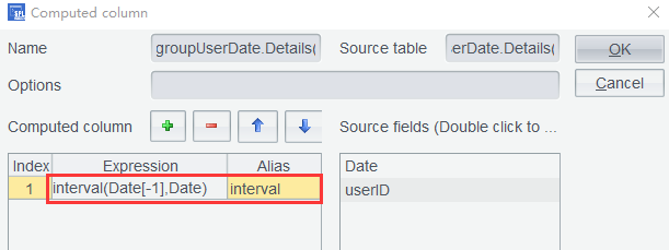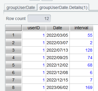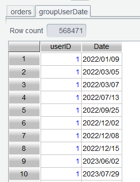如果一天中有多笔订单,使用返回每组的首行,便去掉重复项了,该选项选中后,聚合已经没有意义,所以上图中聚合设置都是禁止编辑的。单击OK后,得到用户下单日结果: