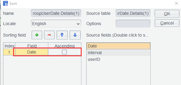 第五步: 现在要找出每个用户的最后下单数据,回到 groupUserDate.Details(1) ,使用界面排序,按日期降序排列。注意,明细表中只能通过图标界面的操作才会同步执行到其他明细表。如果双击列头,虽然也排序,但它只是排的当前明细表。