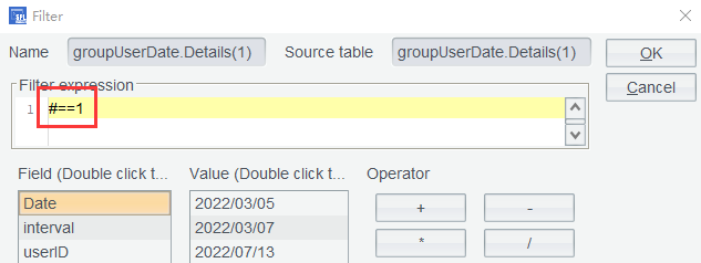 只保留每个用户的最后下单数据,使用过滤表达式#==1,去掉其他行: