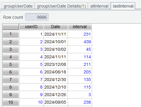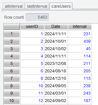 通过跟 lastInterval 中的数据行数比较,一半多的用户需要重点关注,比较符合分析预期。