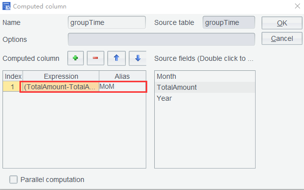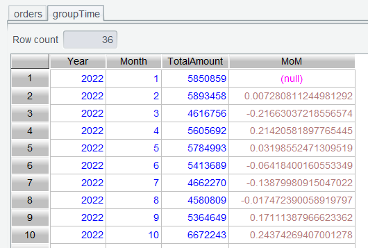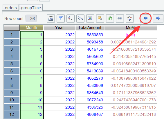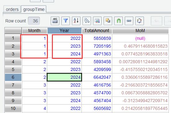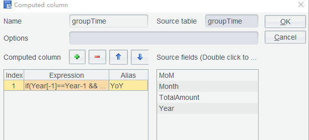 第三步: 使用公式if(Year[-1]==Year-1 && Month[-1]==Month, (TotalAmount-TotalAmount[-1])/TotalAmount[-1], null) 计算同比值,该公式的含义为当相邻两行为相同月份且年份相邻时,则计算(TotalAmount-TotalAmount[-1])/TotalAmount[-1]同比值,否则为 null: