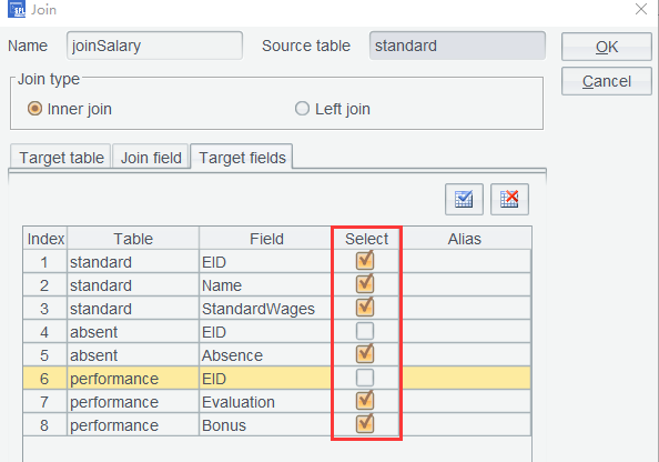 结果似乎不对,员工数量减少了好多。原来表间关联时,分为内连接 (Inner join) 和左连接(Left join)。由于内连接比较常用,比如订单跟订单明细关联时,没有明细的订单会认为是无效订单。SPL WIN 缺省选中的内连接。