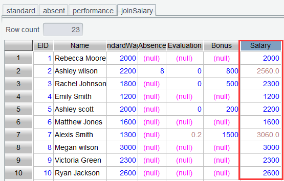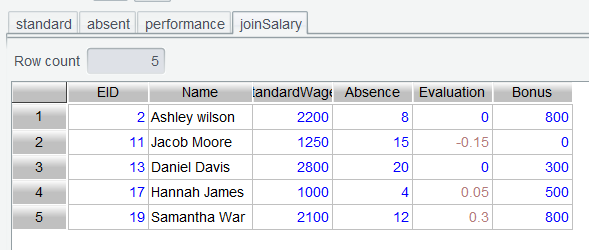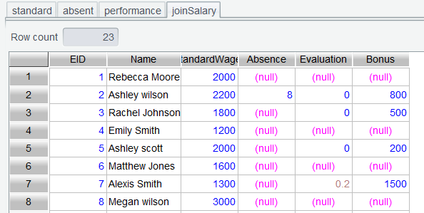 当前表的含义,就是只有同时具有考勤记录以及绩效记录的员工,才会出现在内连接结果中。但肯定只有部分员工缺勤,也只有部分员工有绩效奖励。所以当前关联要以最左边的表为准,比如员工基本工资表 standard ,它有多少员工,关联结果就得有多少员工。