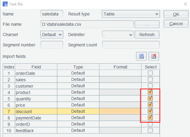 第一步: 在文件列表中选中 saledata.csv,单击浏览按钮,选取所需列: