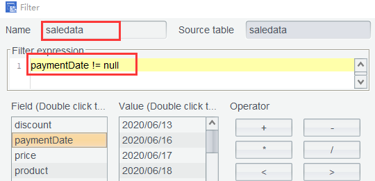 数据中包含仍未付款的订单( paymentDate 值为 null ),再次使用过滤表达式paymentDate!=null,过滤掉未付款的订单:
