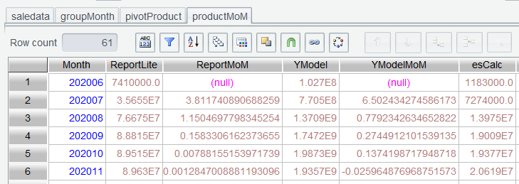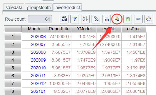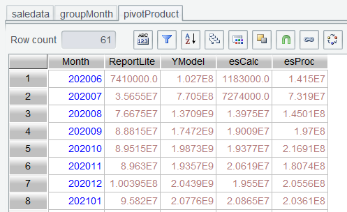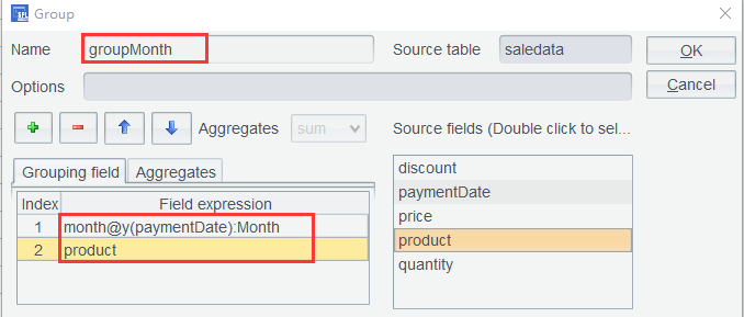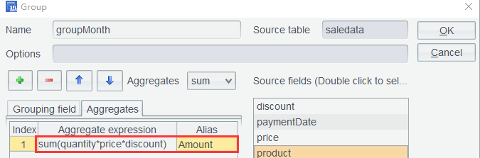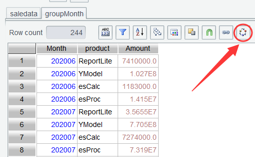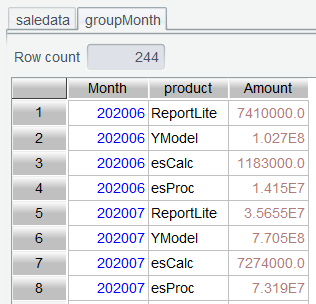第二步:saledata 按月、产品分组统计销售额,表达式month@y(paymentDate)@y选项表示返回yyyyMM格式的整数: