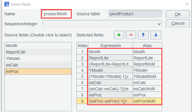 有了月份相邻的产品销售表 pivotProduct ,按产品计算环比,就非常方便了。只要追加环比计算列即可。但这一节,我们用选出字段功能来计算环比。计算列和选出字段的区别为,增加计算列,不会动源表结构,只能在源表列后追加计算列。选出字段则是使用源表中的列,重新按新表达式,计算出新结构的表,所以更灵活,比如可以筛选不需要的列,调整计算后列的顺序等。