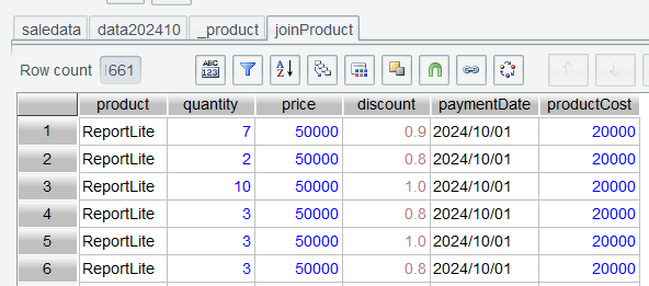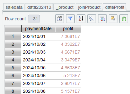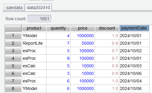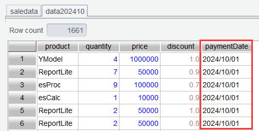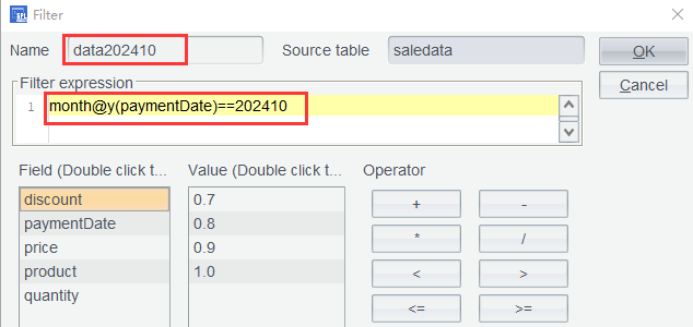 第一步: 仅保留上一节中的 saledata 表,其他表都删除,然后在 saledata 表中使用过滤公式month@y(paymentDate)==202410选出 2024 年 10 月的订单: