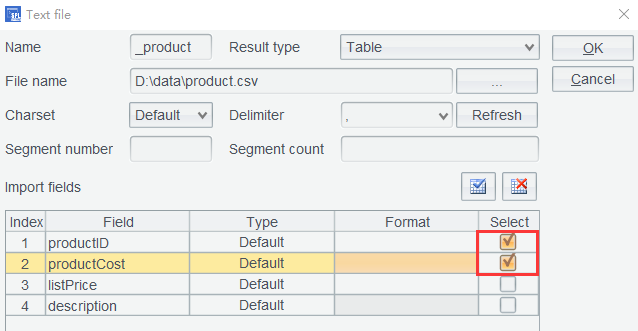第二步: 在文件列表中使用 浏览 按钮,打开 product.csv , 如图选择导入列: