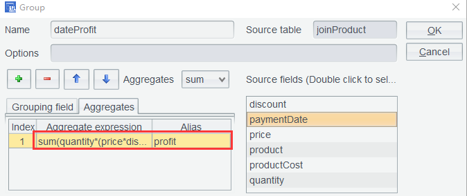 以及聚合项用表达式sum(quantity*(price*discount-productCost))计算毛利率: