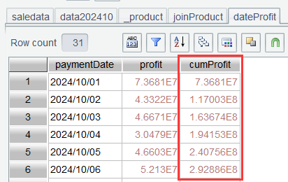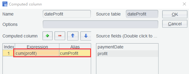 第四步:dateProfit 上增加计算列,表达式设为cum(profit),计算累计毛利润: