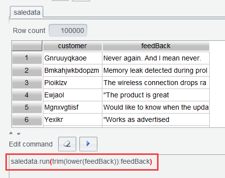 解决方法 2 SPL WIN 有对序表的每行数据直接计算表达式的函数 run 。在手写命令区,执行表达式:saledata.run(trim(lower(feedBack)):feedBack)