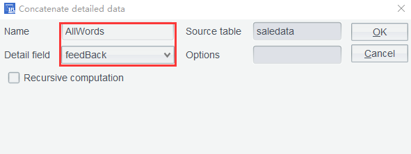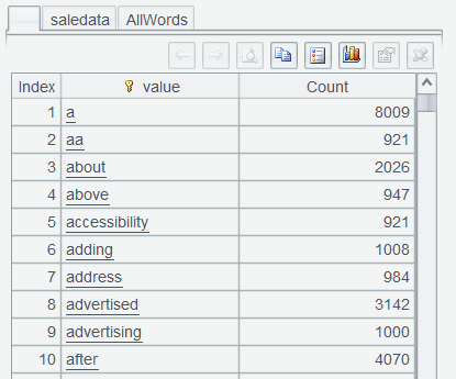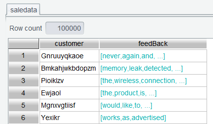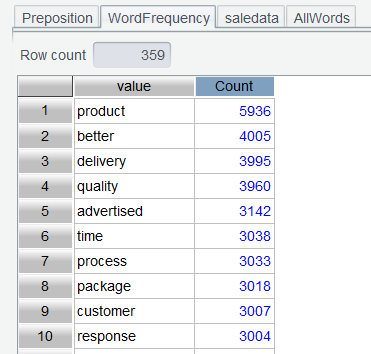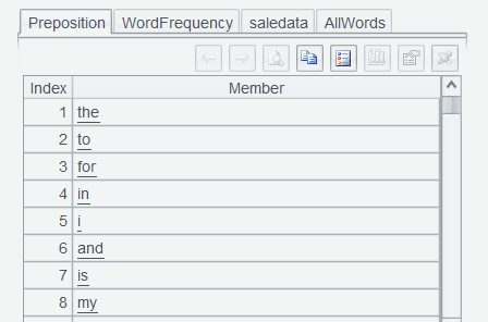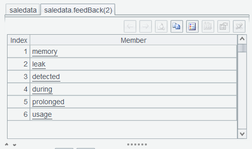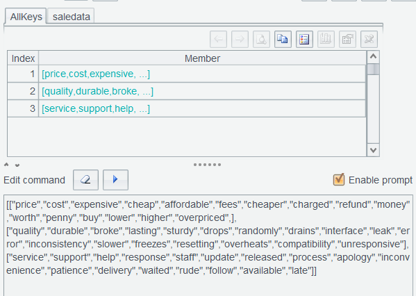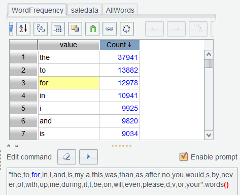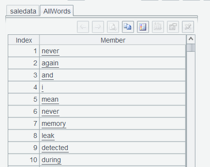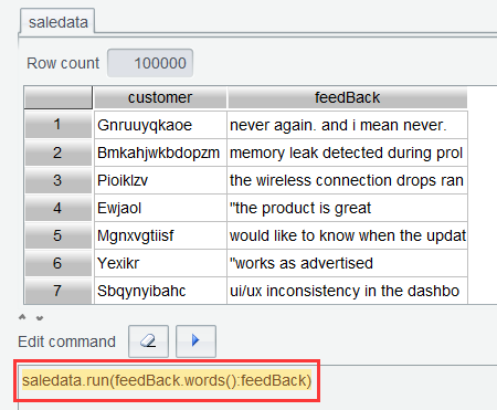表达式中feedBack.words()表示将 feedBack 变成单词序列。上述两步表达式,之所以分开执行,是为了让用户看清每一步函数执行后的效果,待用熟练后,可以连写,一步执行完成。比如saledata.run(trim(lower(feedBack)).words():feedBack)