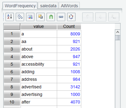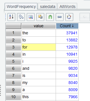 使用排序界面,或者双击 Count 列,均可以对 Count 排序,将 Count 降序排列,以查看最大词频的单词: