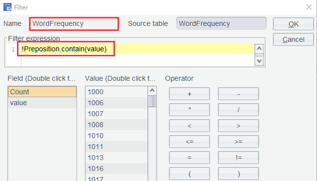 WordFrequency 中单击过滤,输入过滤表达式