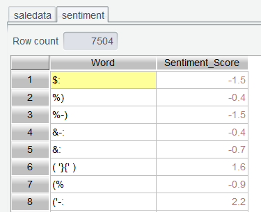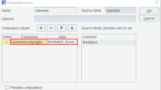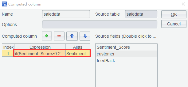 第三步: 将情感词典和客户反馈单词序列关联,计算平均情感得分,在 saledata 表中增加计算列,使用计算表达式