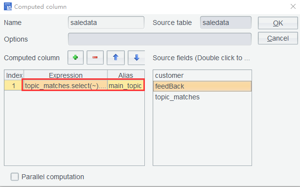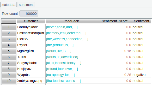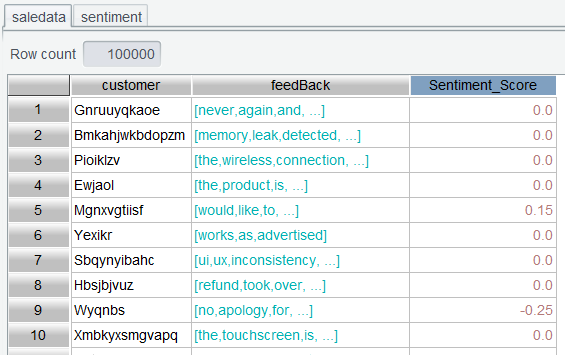 表达式中sentiment.align@b(feedBack:~,Word)的含义为,将sentiment表和feedBack列关联,关联值是feedBack的当前成员和sentimentWord字段。avg(ifn(~.Sentiment_Score,0))表示对关联后的结果算平均得分,其中ifn(~.Sentiment_Score,0)表示如果~.Sentiment_Scorenull,则取 0,以防有些单词不在词典中。
