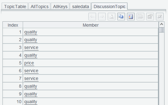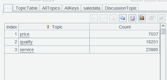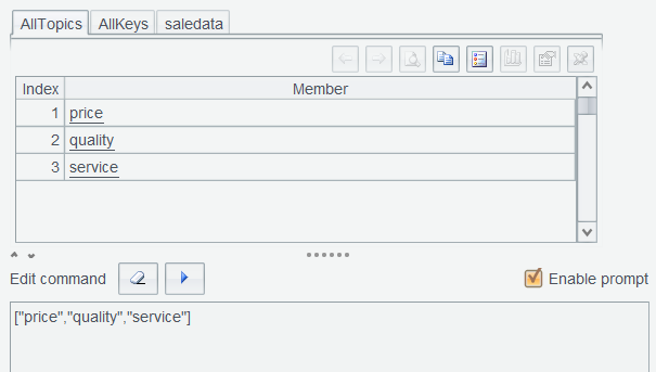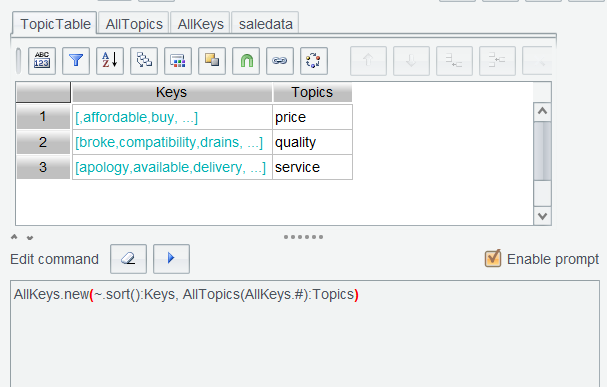 再次执行["price","quality","service"]并将结果命名 AllTopics